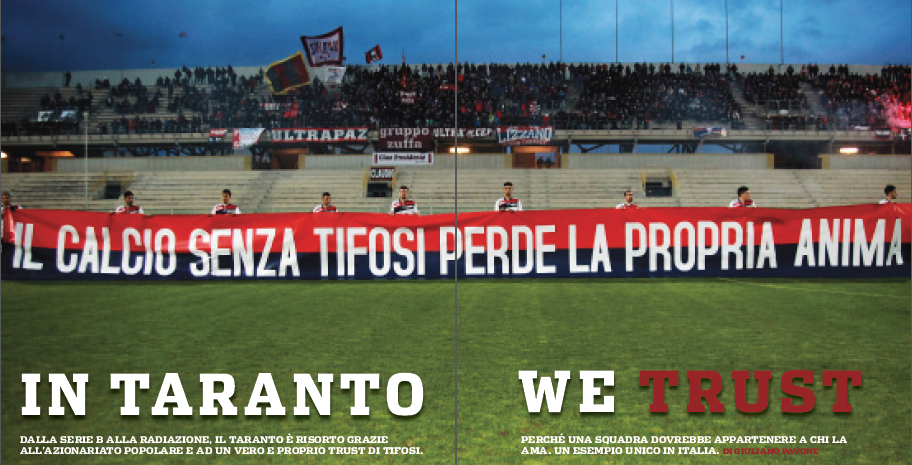 Se il fenomeno è globale e in espansione, l’esperienza tarantina si lega alla particolare situazione che sta vivendo la Città dei due mari. Non è infatti un caso che la nuova alba calcistica tarantina sorga proprio nell’estate 2012, in contemporanea con l’escalation innescata dai provvedimenti giudiziari nei confronti del colosso siderurgico Ilva. Una sorta di terremoto che ha portato alla ribalta nazionale i problemi occupazionali, ambientali e sanitari che attanagliano la città da lungo tempo. Taranto è oggi nella condizione e nella necessità di ripensare profondamente il proprio futuro. Il piacevole effetto collaterale di quella che è una crisi delicatissima e dai risvolti anche drammatici è la fioritura di esperienze di cittadinanza attiva senza precedenti nella storia locale e con pochi termini di paragone nell’intorpidita Italia di oggi. Si sta in altre parole facendo largo la consapevolezza che gli “eroi” e le manne salvifiche hanno fatto il loro tempo e che l’unico modo di tirarsi fuori dai guai è darsi da fare con testa e cuore. Anche i tifosi stanno facendo la loro parte in questo fenomeno, come dimostra ad esempio la “sponsorizzazione popolare”, nei primi mesi del 2012, della squadra con lo slogan “RespiriAMO Taranto”. Una saldatura, questa fra supporter calcistici e questioni cittadine, che non va intesa come straripamento al di fuori del calcio di rozze dinamiche da hooligan, ma al contrario come assunzione da parte del mondo del calcio dei modelli più alti della partecipazione democratica.