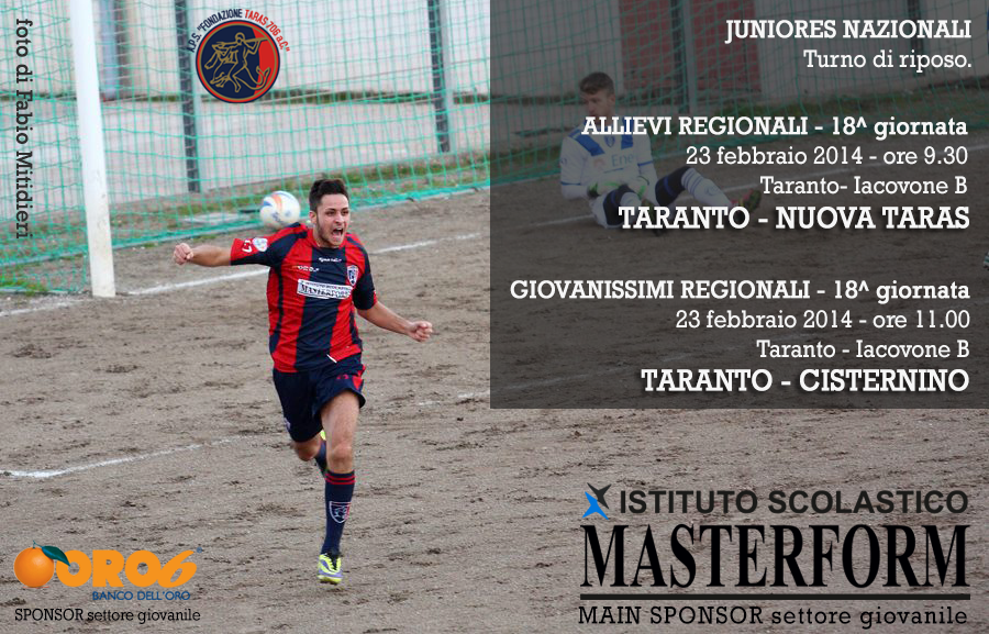 Il Taranto cat. Giovanissimi ospita sul campo B dello Iacovone il Cisternino, fanalino di coda con soli 7 punti all’attivo. Ai ragazzi di Mister Malacari servirà concentrazione per guadagnare 3 punti preziosi per rafforzare il primato in classifica e vedere la vittoria del girone F a portata di mano.