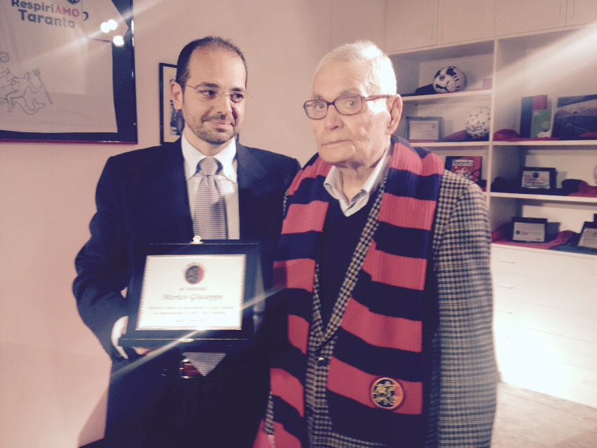 La memoria storica si chiama Giuseppe Merico, tifoso rossoblù testimone di tutti i campionati che il Taranto ha giocato nella sua storia. Novantadue anni di età, abbonato di tribuna fin da quando era bambino, Giuseppe, come ogni tifoso che si rispetti non si lascia condizionare dalla categoria e ancora oggi non si perde neanche una partita del Magico. Lo abbiamo premiato nella nostra sede con una targa simbolica consegnata dal presidente Mongelli in rappresentanza di tutto il trust tarantino.