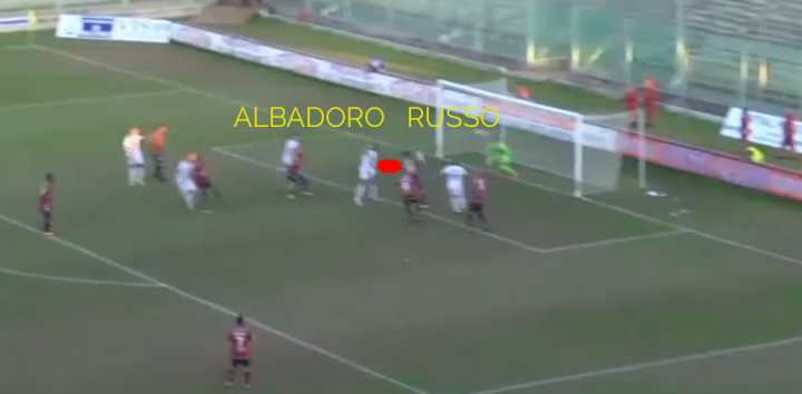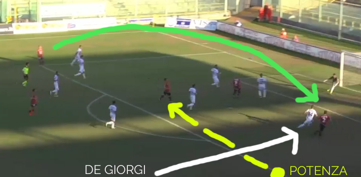 Bollino e Potenza cambiano talvolta zona di competenza, come in questo caso. Nel fermo immagine, la corrispondenza fascia sinistra/piede sinistro invita Bollino a crossare: Potenza capisce l’intento del compagno, viene dentro al campo e libera la fascia per la discesa profonda di De Giorgi. L’esterno non riesce a impattare il pallone in modo opportuno e a chiudere al meglio l’ottima azione, grazie al ripiegamento profondo (grande attenzione) di Calderini. Eccolo, il calcio!