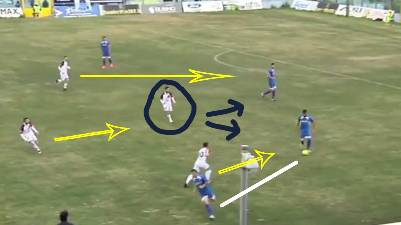 Il Taranto accenna il pressing offensivo quando la manovra aretusea torna indietro. Valente scarica su Sciannamè, l’anello debole della difesa nella gestione del possesso, con Bollino che si scaglia prontamente in pressione sul terzino. Viola (nel cerchio) è pronto a studiare lo sviluppo: in questa occasione dà una mano al compagno e i rossoblù recuperano una palla importante in zona alta. Magnaghi scatta, evita fuorigioco, ma la scucchiaiata di Sampietro sarà imprecisa e terminerà tra le braccia di Santurro.
