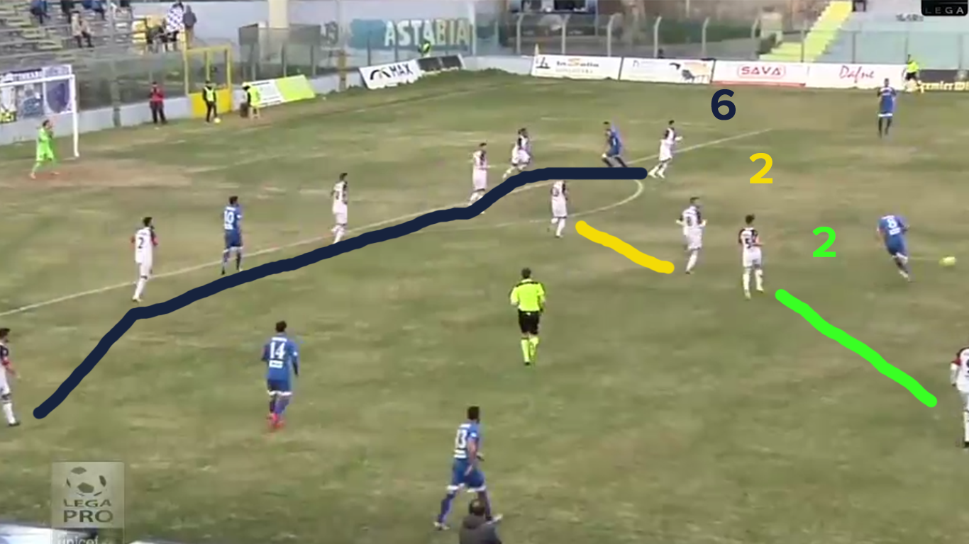 Il Taranto non deroga al 6-2-2 in fase di non possesso, rimanendo molto basso e compatto nei 30 metri. Nell’occasione l’ultimo a sinistra della linea difensiva è addirittura Viola, in ragione di uno dei cambi di posizione fra lo stesso e Paolucci sovente visti durante il match. Lo Sicco e Sampietro si posizionano in verticale, Paolucci dà uno sguardo al portatore, pronto eventualmente a ripartire con l’ausilio di Magnaghi, l’unico a non avere compiti veri e propri in fase di non possesso.