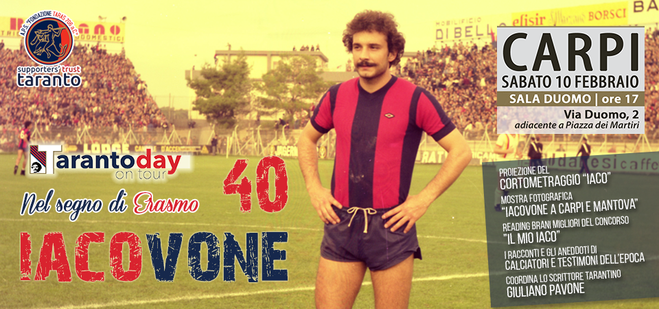 Come annunciato nei giorni scorsi, la Fondazione Taras organizza un evento commemorativo dedicato ad Erasmo Iacovone, a 40 anni dalla sua tragica scomparsa, che si terrà a Carpi. L’appuntamento è per sabato 10 febbraio a partire dalle ore 17, presso la Sala Duomo nelle adiacenze della centralissima Piazza dei Martiri, cuore pulsante della cittadina in cui Erasmo è esploso come bomber e ha trovato l’amore. Assieme a Paola e Rosy si raduneranno amici e testimoni dell’epoca, ex-calciatori e addetti ai lavori, comuni tifosi (non solo tarantini ma anche carpigiani e mantovani).