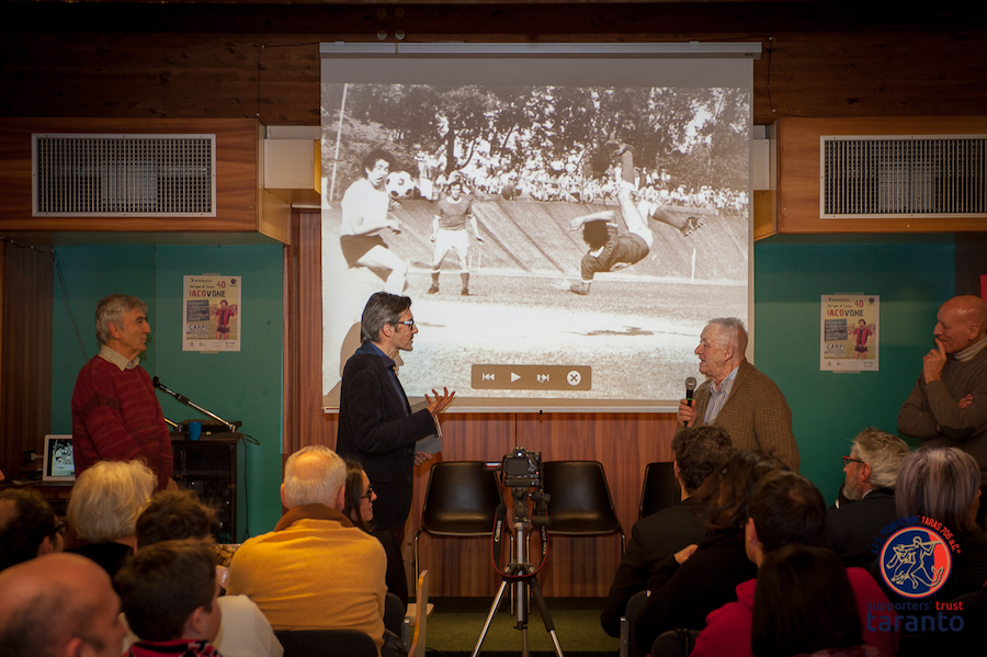 Le storie dei primi calci a Capracotta e Tivoli si sono dunque intrecciate, in questo intenso pomeriggio, agli aneddoti di compagni e giornalisti che hanno seguito le gesta del giovane Iacovone a Carpi e Mantova. Infine, Taranto, la sua venerazione e il suo riunirsi tutta, forse per un’unica volta, nelle gesta e nella scomparsa del grande Erasmo. A impersonare il racconto della fede dei tarantini è stata la voce di Massimo Cimaglia, che ha letto diversi passaggi estratti dai testi del concorso “Il mio Iaco”, insieme ad alcuni altri brani di scrittori tarantini.
